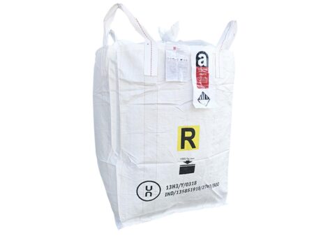 Big Bag tubolare omologato ONU 13H3/Y (90x90x120 cm) con caramella superiore e fondo chiuso. Realizzato in polipropilene stabilizzato ai raggi UV con liner interno in polietilene, garantisce sicurezza e protezione per carichi fino a 1000 kg.